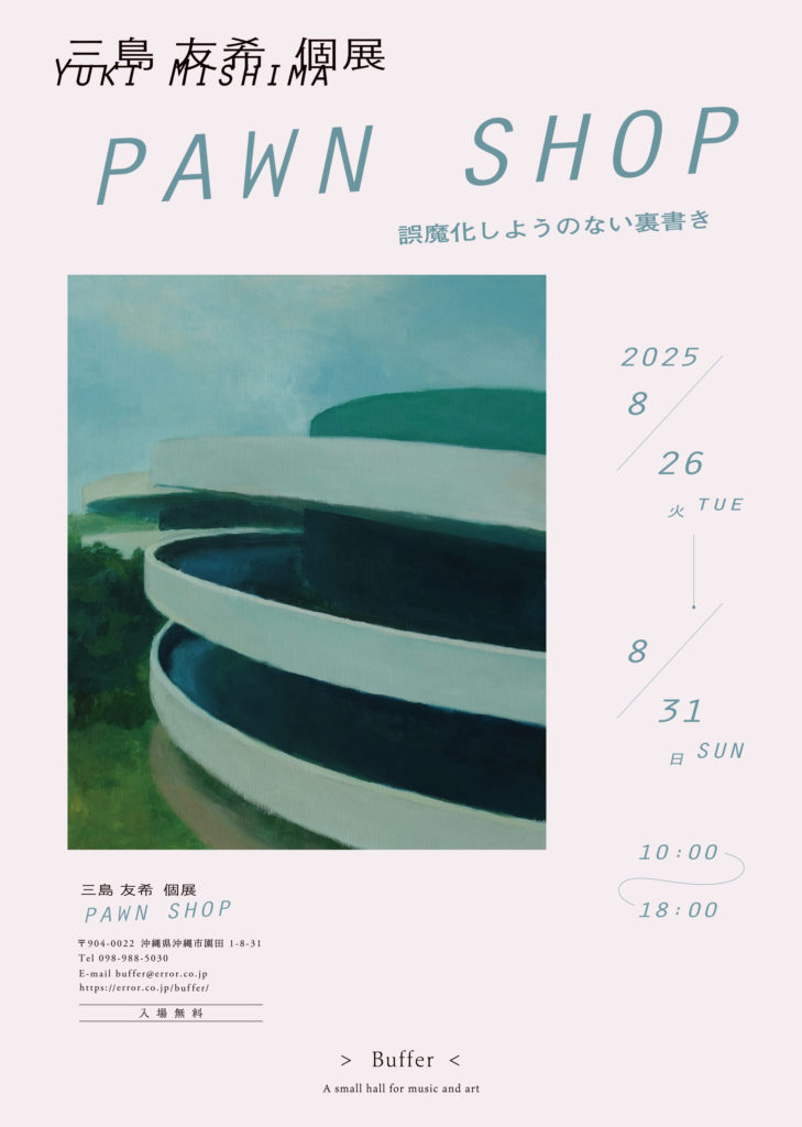 美術家・三島友希が、沖縄市園田のギャラリースペース「Buffer」にて個展『PAWN SHOP』を開催。本展は6年ぶりの個展、そして絵画作品に絞り臨んだ展覧会として一般公開されます。会期中入場無料。